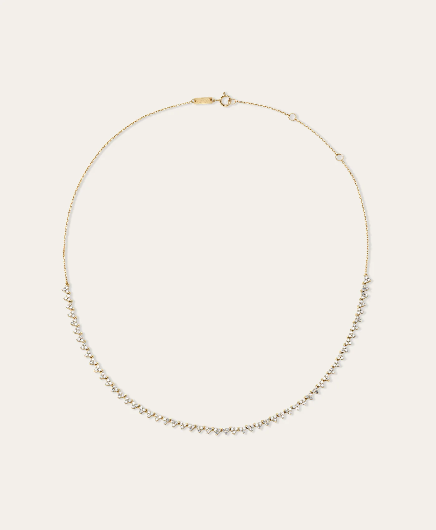 14k yellow gold riviera necklace with 3 prong-set diamond clusters.Ā